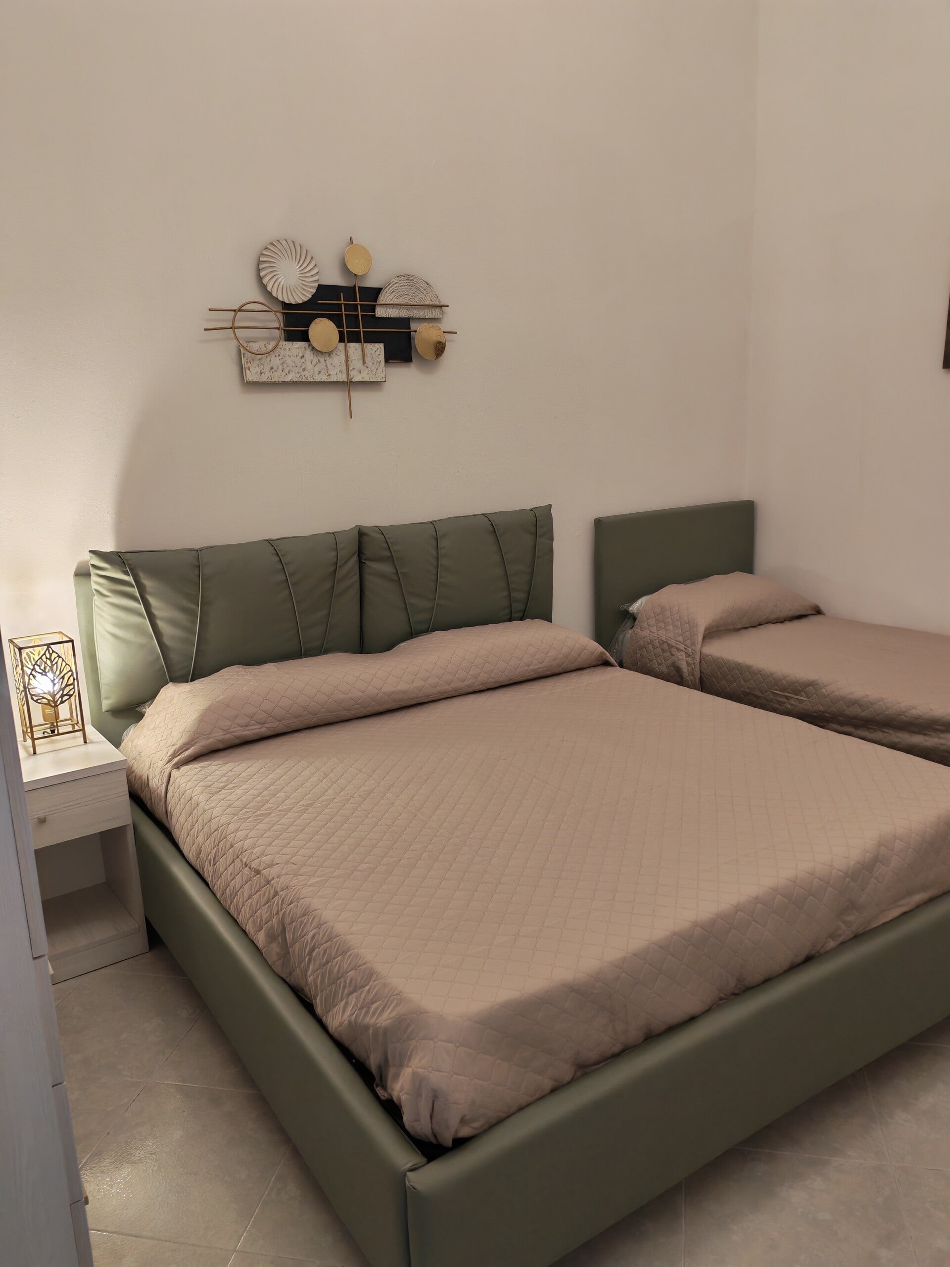 Questa casa vacanza è ideale per coppie e famiglie con bambini. Dispone di due camere da letto comunicanti, ognuna dotata di un letto matrimoniale e un letto singolo. È un ambiente moderno e accogliente, pensato per il tuo relax.